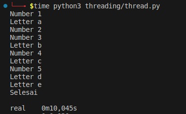 numbers maupun letters dijalankan secara linear sehingga kita akan mendapatkan hasil proses sebanyak 15 detik. selanjutkan kita akan ubah code diatas menjadi multithread. perlu di pahami bahwa terdapat penyesuaian code dari cara pemanggilan fungsi.