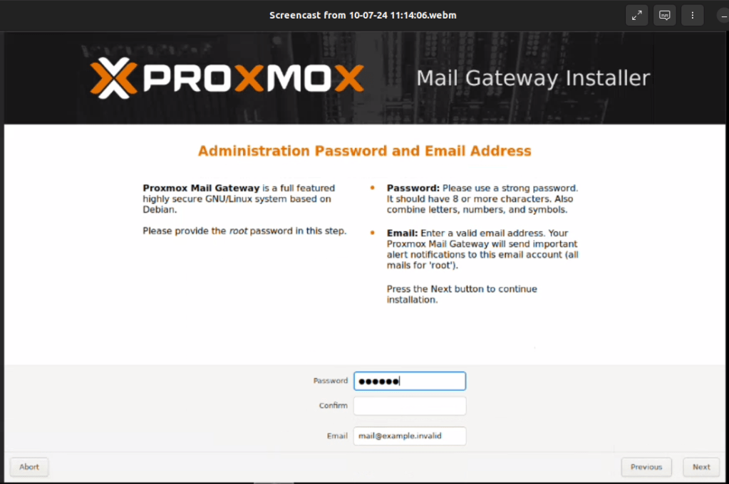 - Create password for login and insert your email Proxmox will email you if something happen in your server