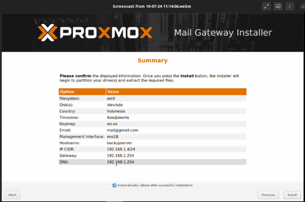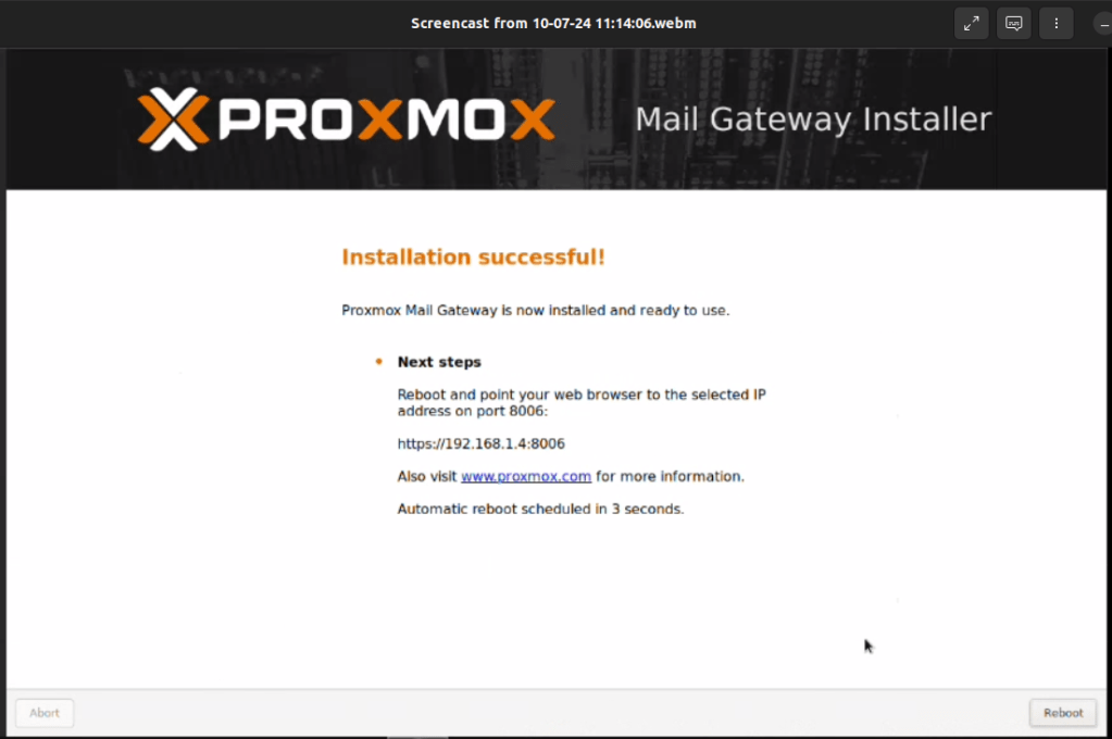 - After installation Proxmox will reboot itself after the reboot you got your own Mail Server